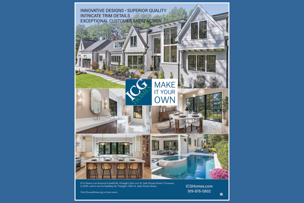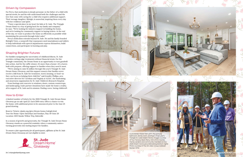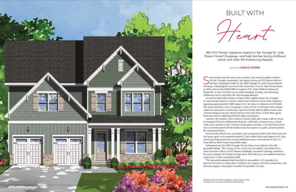 In addition, Triangle Family includes a special spotlight article on ICG’s St. Jude Dream Home® project, featured on pages 32–35. This inspiring piece highlights their continued commitment to building with purpose and supporting families through the mission of St. Jude Children’s Research Hospital. The article showcases the 2026 Triangle St. Jude Dream Home and the impact this project has on the fight against childhood cancer. The ICG team is honored to be part of such meaningful work and grateful for the opportunity to share this story with their community. Be sure to grab your copies and check it out!