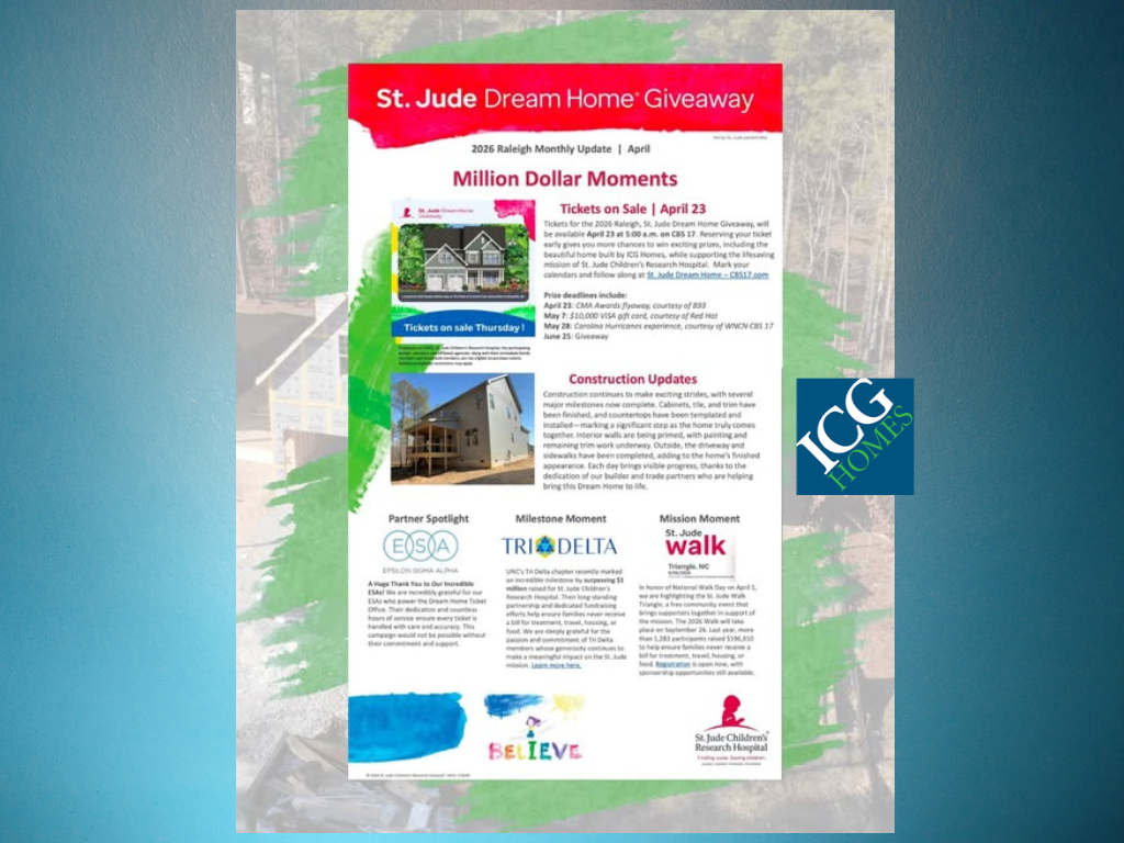 Tickets for the Triangle’s 2026 St. Jude Dream Home® Giveaway are now available! Reserve yours for a chance to win a beautiful home by ICG Homes—plus exciting prizes along the way.